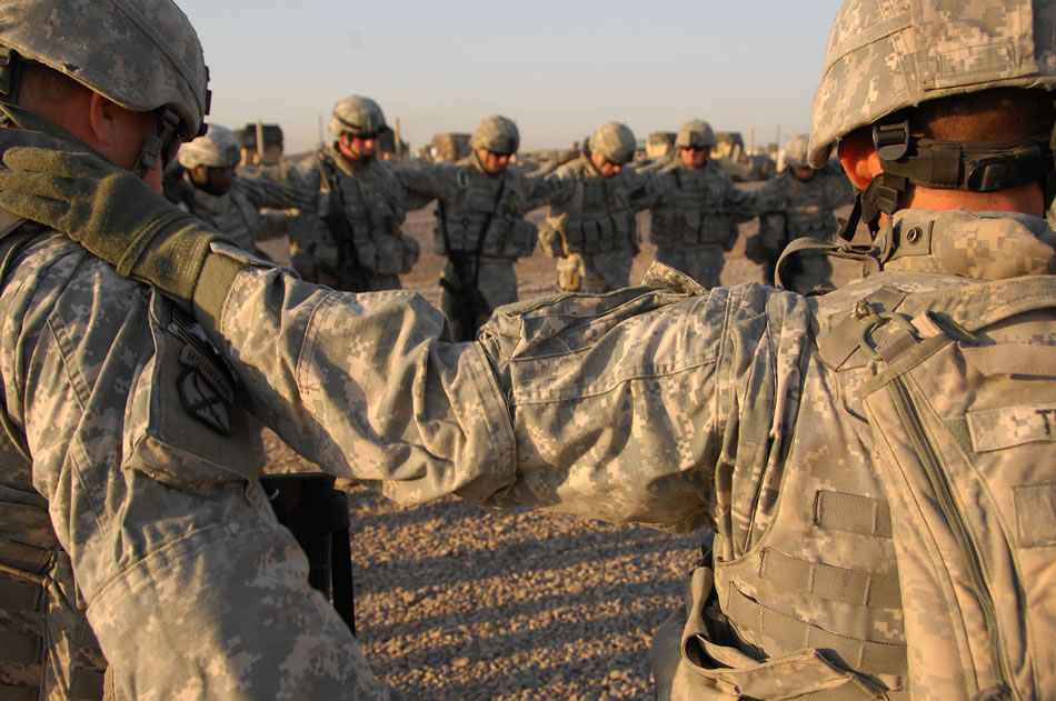 Soldiers from Alpha Battery, 2nd Battalion, 32nd Field Artillery Regiment, attached to 2nd Brigade Combat Team, 1st Cavalry Division, say a pre-mission prayer at Forward Operating Base Liberty, Iraq, on Oct. 29, 2007. Photographer: Spc. Charles Gill